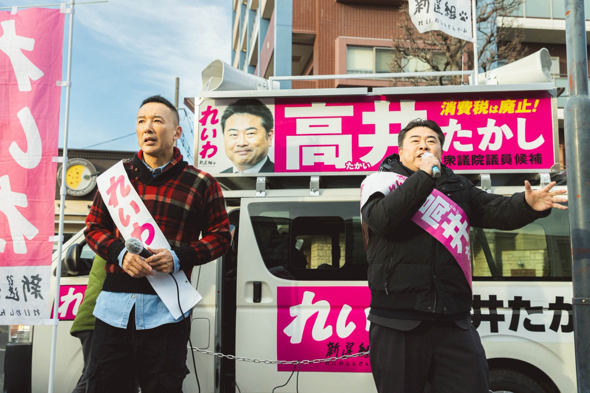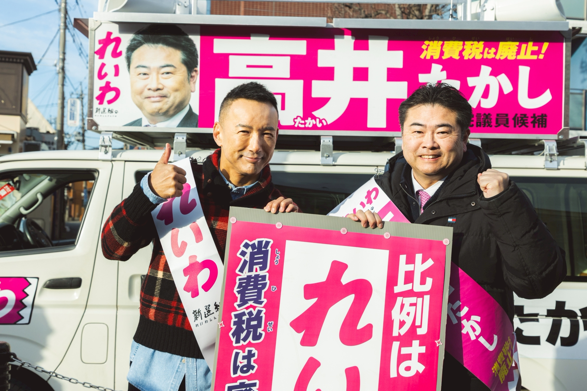 ありがとうございます。朝から大きな音で申し訳ございません。高井たかし、れいわ新選組の幹事長でございます。ここ、久喜の皆さんと一緒に日本を変えていく、その先頭に立たせていただいております。今、非常に厳しい戦い。国会で能力のある議員、非常に少ないです。皆さんもテレビ見てて居眠りばっかりしてるおっちゃんたち、よく見かけますよね。高井たかしは国会の中でも、政策立案能力、ナンバーワンでございます。あとは大きな権力を手に入れるだけ。自民党が政権与党を握っている限りは、日本の経済は良くなりません。失われた30年をつくり出したのは自民党。そして先進国でただひとつ、国民生活が本当に底が抜けきった状態にある日本を立て直すためには、このような優秀、政策立案能力の高い人が国会で活躍する必要があるんです。今のままでは自民党で300議席を超える勢い。失われた30年、日本を衰退させた30年、それをつくり出した自民党が、この先もこの日本を担っていくということを考えるならば、失われた40年は確実。今、やらなきゃいけないことは簡単。みんなの使えるお金を増やさなきゃダメなんです。30年の不況を終わらせる、失われた40年にしないためには、大胆な経済政策が必要。やらせてください。消費税の廃止です。既にいろんな党が消費税の廃止、減税についてはそれぞれ言ってますけれど、選挙では訴えても国会に戻ってから、ほとんどそのことについて仕事をしないんですね。選挙のときだけみんなが喜ぶことを言って、国会の中に行けば違うことをやり続けている。これでは皆さんの生活は楽にはなりません。だからこそ、消費税廃止。その先頭、2019年から担っているれいわ新選組、1議席でも多く国会に送っていただきたい。そのためには、久喜の皆さん、蓮田の皆さん、幸手の皆さん、白岡の皆さん、伊奈町、宮代、杉戸の皆さん。高井たかし、高井たかしにお力を貸していただきたい。国民の6割が生活が苦しい中、数千万円もの裏金を手に入れて、そして自分の議員バッジだけは確保しようとする者、そしてカルト教団である統一教会の290名もの応援を受ける国会議員。そして国保、第2の税金としてみんなの首が締まっているのに、どうして下げないんですか? 下げて当たり前。国のお金で国保は下げる。社会保障費、下げていく。みんなの負担を減らしていく。景気が悪いときにやるべきことは、はっきりしてるんです。それができるのが高井たかし、高井たかし。本当に義理人情に厚い人なんですよ。この人がいなかったら今のれいわはない。この人を国会に戻さなければ、あまりにもあり得ない社会だと思います。政治とは、あなたの未来の保険なんですよ。1時間後が約束されてる人、いません。5分後の自分、約束されてる人、いません。明日はどうなるかなんてわからない。一寸先は闇。だからこそ、その闇を照らす光となるのが政治。あなたの将来を保障するものが政治であってほしい。それを実現するためにも、高井たかしを、どうか国会に送ってください。お力を貸してください。高井たかし、選挙区は高井たかし。比例は全国どこからでも、れいわ、れいわとお力を貸してください。よろしくお願いいたします。ありがとうございます。ありがとうございます。ありがとうございます。