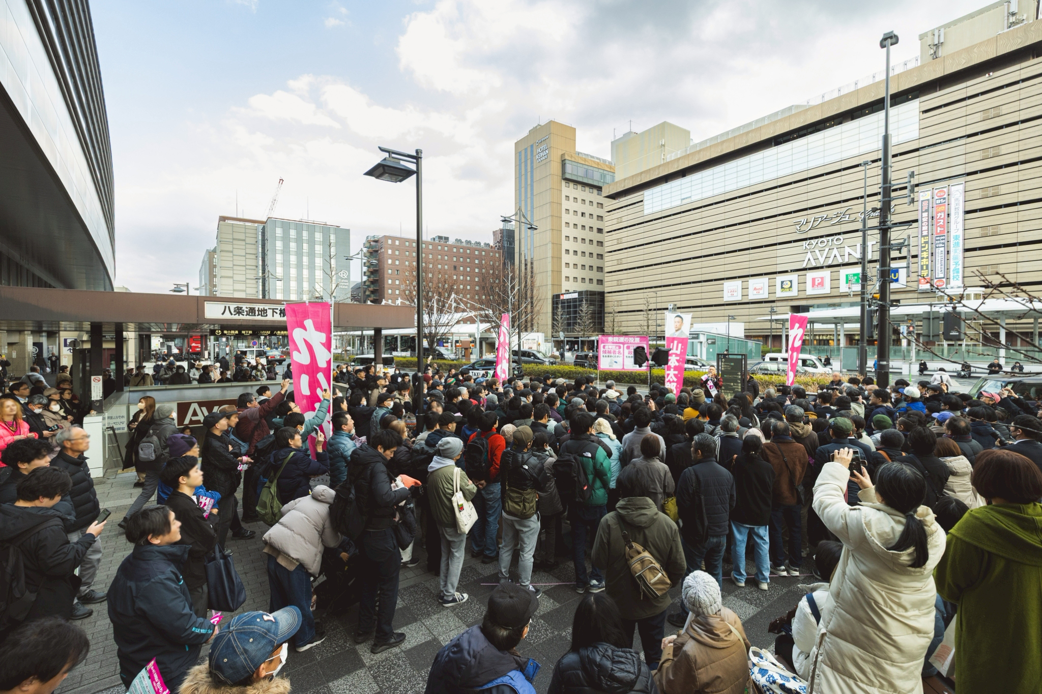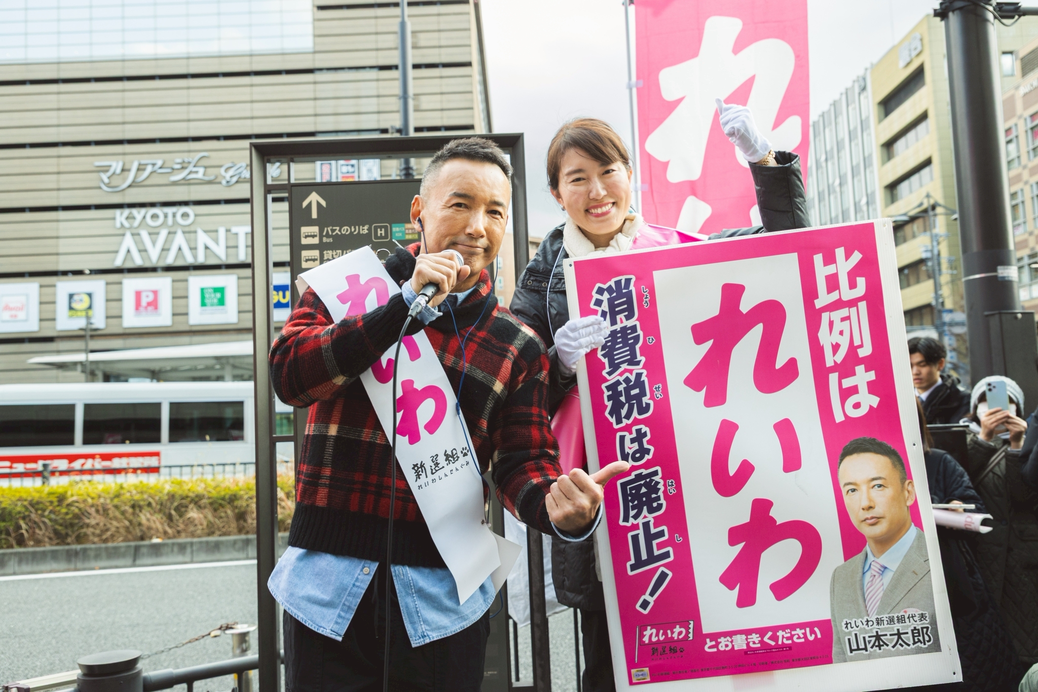 300議席をうかがう? いい加減にしろ、マスコミ。企業が儲かれば、広告宣伝費がもっと儲かるようになる。そのようなことでこれまでいくつもの真実を国民に騙し隠し続けてきた。消費税は社会保障の財源などではない。消費税がなければ社会保障が維持できないなんて大嘘。消費税収の約6割が大企業減税の穴埋めに使われている。これが事実でしょ。30年の間に大企業を中心とする法人税の減税は20%減税されてますよ。その間に皆さん減税された? その減税を実現するために生まれたのが、穴埋めとしての消費税。あなたが支えているのは、あなたの社会保障とかそういう問題ではなく、あなたの老後ではなく、大企業の利益をより増やしていくために、あなた自身が搾り取られているということを、もっと一緒に怒っていただきたい。消費税は廃止にできる。財源がないわけじゃない。金はあるがみんなのためには使わない、こんな腐った政治は倒すしかないんですよ。そのチャンスがこの選挙。あと2日ある。この2日で一緒に日本の未来を変えていきませんか。それを言うためにマイク握ることにしたんです。力貸してほしい。全国どこからでもピンクの投票用紙、比例は「れいわ」、ピンクの投票用紙、比例は「れいわ」。れいわ新選組、ここ近畿ブロック、京都から立候補してくれているね、候補者がいるんですよ。西郷さん来て。紹介だけしろっつったけど、むちゃくちゃいい人材やから、ちょっとマイク握って。