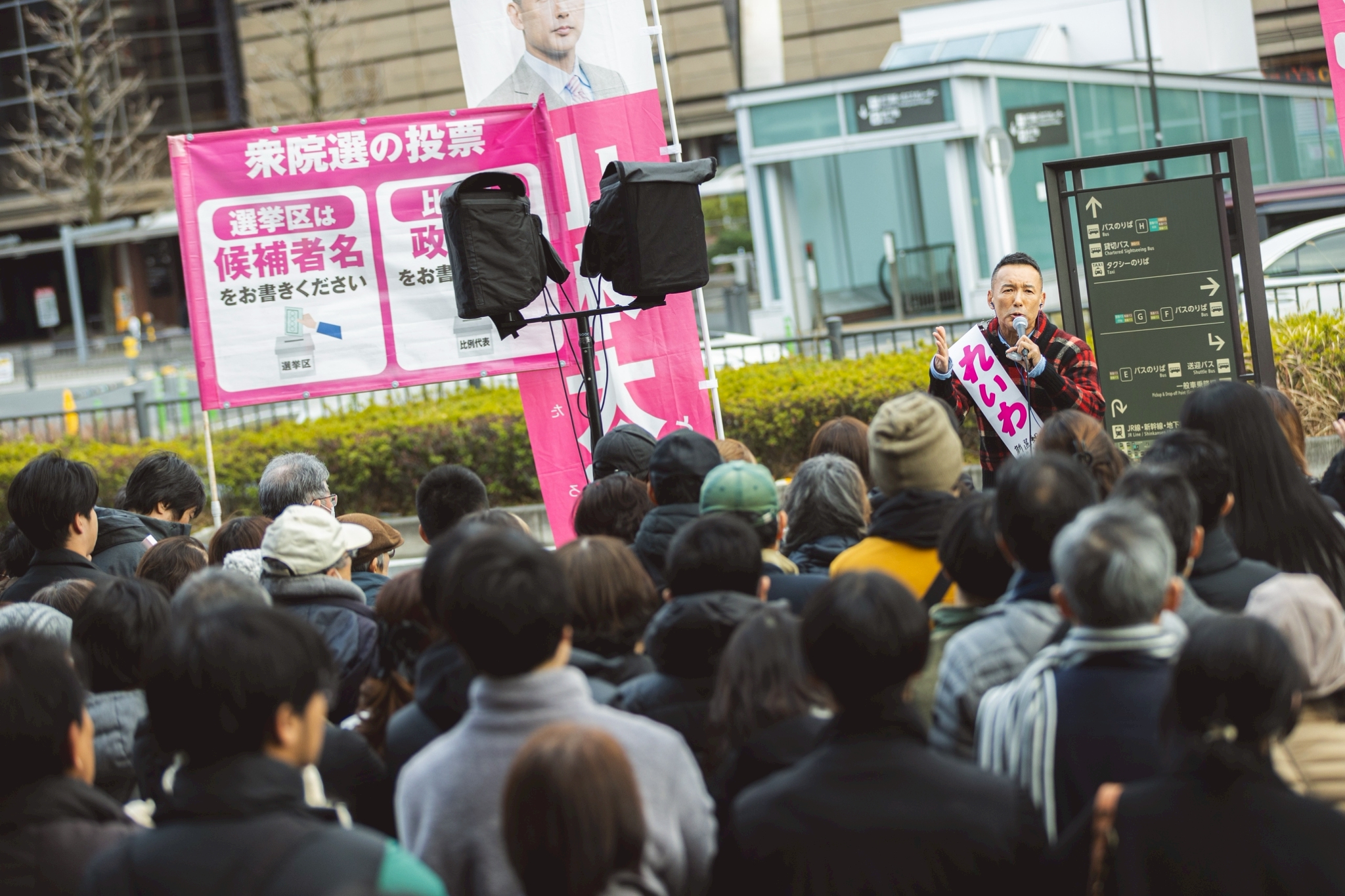 あまりにもひどい妖怪だらけの永田町、ここにやって参ったのがれいわ新選組。れいわの時代の鬼退治。どうかその先頭に立たせていただきたい。党首、代表の山本太郎は、今や病気で休場状態ですけれども、これを引き継ぐ猛者たちが必ずや国会で皆さんのために汗を流し、体を張ってでもさまざまな悪行を止めて参ります。ちょっと一回、オフィシャルいきます。比例は「れいわ」、比例は「れいわ」。ピンク色の投票用紙、全国どこからでも比例は「れいわ」。最初ね、これね、マスコミね、選挙始まっていきなり「今回、れいわ新選組、議席獲得厳しいです」みたいなことをね、勝手に流し始めて。そうなったら選択肢としてまず落ちるじゃないですか。で、今、予想どうなってるかっつったら2議席から6議席みたいに増えてるんですよ。最初のあれ何やってん?っていうね。ネガティブキャンペーンやめろや、みたいな。一方で議席数がれいわよりも全然少ない、何やったっけあれ? 何かITっぽい何か? 何やったあれ? あ、チームみらいや。チームみらい、激推ししてるんですよ、マスコミ。すごくないですか? 政策見ました? 維新と変わりませんよ。若くなった竹中平蔵ですから、あれ。気を付けてください。騙されちゃダメだよ。踊らされちゃダメだよ。その世界観が好きな人は一緒に踊ればいい。けれども踊った後にやってくるのは何か? 痛みに耐えろということが再度求められる。自民党、維新と変わらないような者たち、若い人たちに託したいと言っても、託す先を間違えてしまえば、あなたやあなたの大切な人たちの首がさらに締まるということでございます。さぁ、この先の未来をみんなでつくっていこうじゃないか。私たちがやるんじゃない。私たちと一緒にやってください。それがれいわ新選組です。力を合わせよう。未来を変えよう。お願いします。ラスト2日。比例は「れいわ」。ピンクの投票用紙、比例は「れいわ」でお力添えを。ありがとうございました。