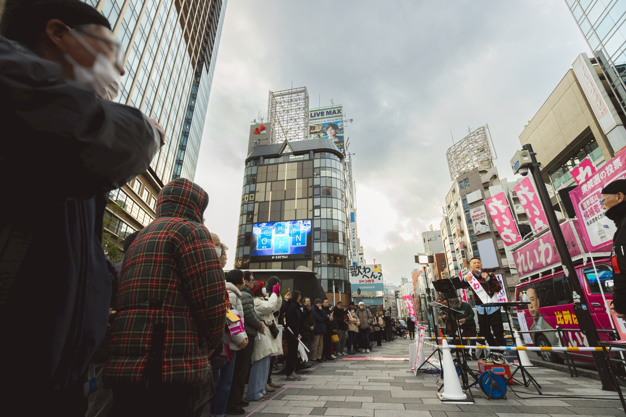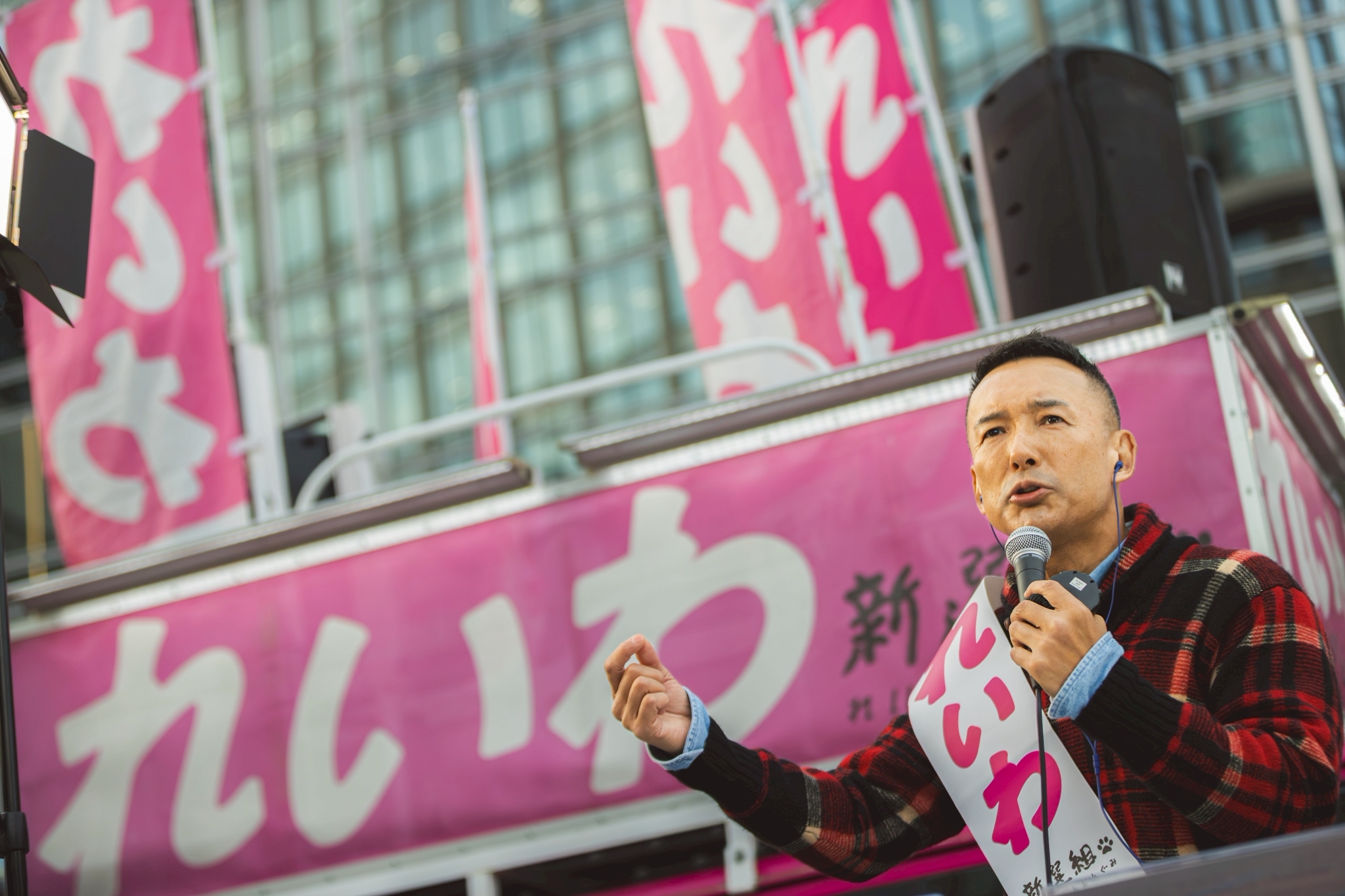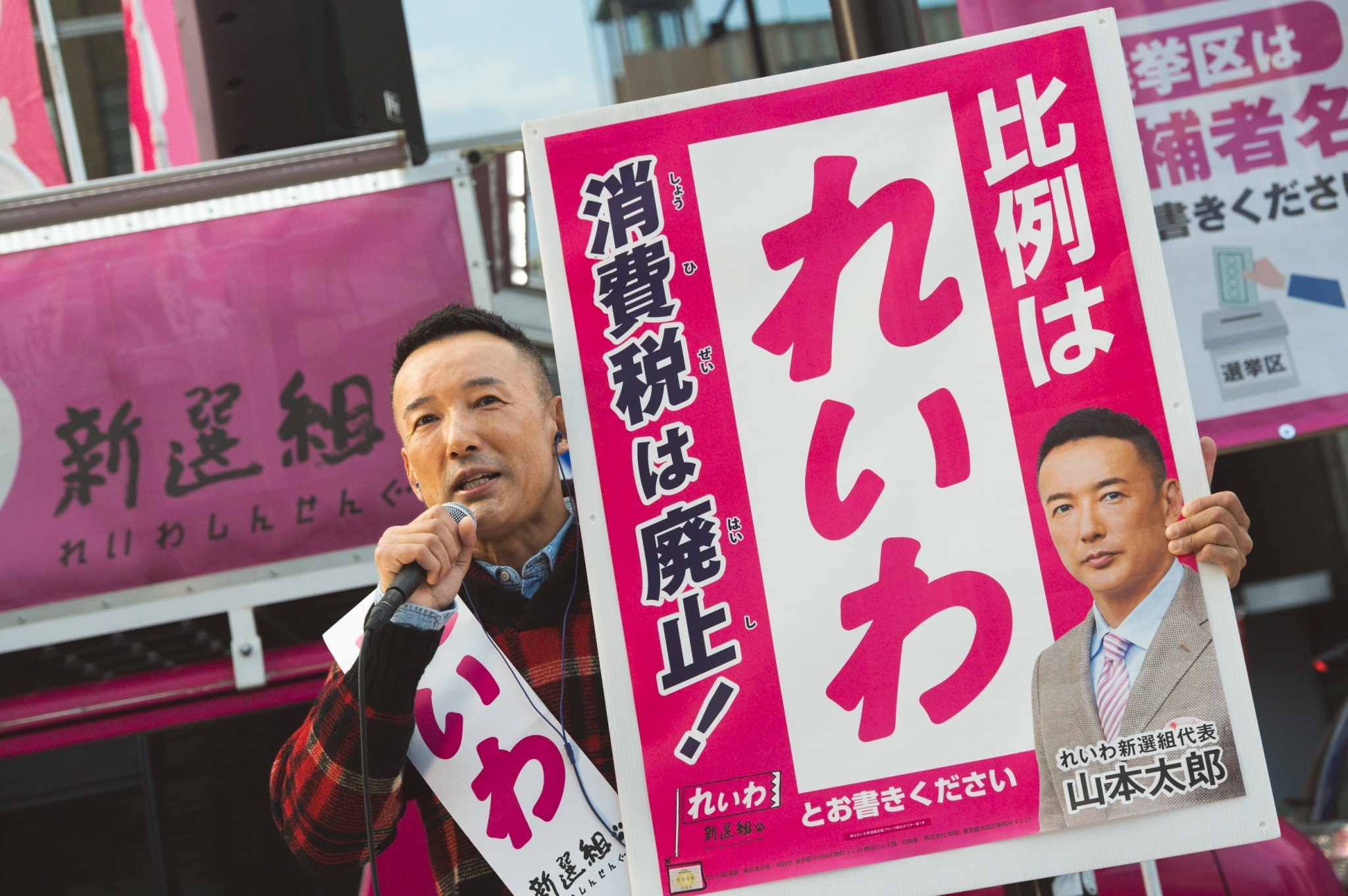 このような有権者を愚弄するようなことを当たり前に行なっている。そのようなことをどうしてマスコミは追及しないの? お仲間じゃないかよ。何よりも消費税自体が社会保障にはほとんど関係のない財源であるってことを、どうしてテレビ・新聞は言わないんだ? 消費税の正体とは、大企業に減税するための穴埋めなんです。直間比率の是正の名のもとに、彼らの負担を下げるために他から取るという道を選んだ。それが消費税の始まり。社会保障のために必要? でたらめはやめてくれなんです。30年振り返ってみれば、何が起こってるかがわかる。この30年の間に大企業に対しての減税、20%くらい減税されてます。皆さんそれくらい減税してもらえた? してもらえてない。そしてこの30年データで見てみれば何が言えるか? あなたが一生懸命納めた消費税、中小企業が借り入れしてでも払ってきた消費税、30年遡れば消費税収のうちの約6割が、大企業減税の穴埋めに使われていたと言える。どうして言わないんだ?新聞。どうして言わないんだ?テレビ。答えは簡単、利害関係者だからです。新聞は軽減税率の対象ですからね。消費税、これの軽減、飴玉もらっている者たちが消費税のからくりなんて口に出しません。じゃあテレビはどうして言わないんだって? テレビの株主見てみてよ。新聞社入ってるでしょ? クロスオーナーシップ? 冗談じゃない。これによって多くの真実が、国民が知るということを妨げてきた。こういったほとんどグルというような状況の国会の中で、私たちのような訴えをしていくっていうのは非常に四面楚歌。周りは敵だらけ。でも言わなきゃダメなんですよ。この力を大きくしてほしいんです。もっともっと揺らせるように私たちに力を貸してほしいんですよ。れいわ新選組はブレたことがない。裏切ったことがない。本物の草の根の政党。バックに宗教なし。バックに大きな企業もついていない。一人ひとりの人々が未来を憂いて、なんとかしたいという思いで、自分の1票を横の人に拡げる。その繰り返しでここまで来た。国会議員15人になり、地方議員60人になった。草の根政党を偽装する、そんなカルトは存在するが、正真正銘の草の根政党をあなたの力で育てていただきたい。ひっくり返してやろうじゃないか。力貸してもらえませんか。300議席なんて渡しちゃダメだ。徹底的にやるぞ、体張ってでも止めるという政党を、どうか国会に送り込んでいただきたい。そのチャンスがこの選挙。あなたの未来を2日かけて変えていこう。その提案のために、今日この場に立たせていただきました。お願いがあります。今回投票所に行ったら、ピンクの投票用紙をもらいます。ピンクの投票用紙は比例、比例と呼ばれるものです。この比例の投票用紙にはひらがな3文字で「れいわ」、ひらがな3文字で「れいわ」とお書きください。力貸して!横に拡げて!お願いします。ありがとうございます。ありがとうございます。れいわ新選組山本太郎、マイクを握らせていただいております。今から簡単にインフォメーションしたいと思います。れいわ新選組ですか。なるほど。何か私にできることありますかね。そう考えてくださる心優しき人が、もしもこの中にいたならば、どうすれば私たちに力を貸していただけるか簡単にお話しします。まず、「比例はれいわ」と書かれたビラがあります。このビラ、もしよかったら、配っていただけないでしょうか。衆議院選挙、ビラを配れるけれどもポスティングできないんです。ポスティングできないということならば、これは直接配る以外方法がないんですね。一方で、大きな政党は資金は潤沢。だからテレビで地上波でもコマーシャル流しまくれるんですよ。見たことあるでしょ。資本が大きな政党は、いくらでもやり方はあるけれども、そういったものがない私たちのような小さなグループは、このような形、弱い者たちは強くなれないようなルールの中で戦うしかない。相手の土俵で戦うしかないんです。だから、そこでお力を貸していただきたい。「比例はれいわ」と書かれたビラ配り。これポスティングはNGとなりますけれども、どうかあなたにもそのチラシ配り手伝っていただければ。今、その説明はこちらにブースがございます。私の左側、皆さんから見たら右側になるかもしれません。こちらで、もしもご興味ある方いらっしゃったらご説明させていただきますので、後ほどお越しください。そして「比例はれいわ」と書かれたポスターがございます。選挙期間中、ポスターを貼らせていただけませんかとお声掛けいただいて、貼らせてくれるおうちがあるならば、その壁をお借りする。お店の壁をお借りする。これ合法的にやれます。ぜひ1枚でも多くこのような形で多くの人々の目にとまる。そんなこのポスターで拡大のお手伝いをいただけないでしょうか。先ほどのビラ、ポスター、その両方、こちらのブースでお話が聞けるようになっております。そし